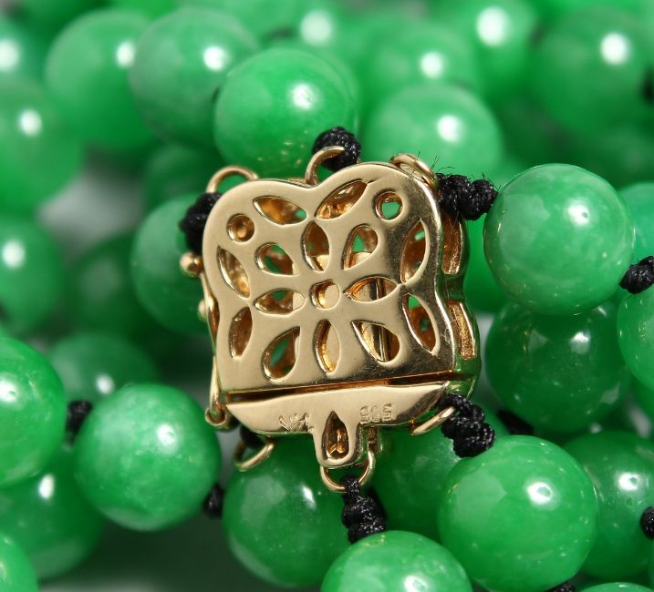 A LONG STRING OF JADE BEADS with 18ct and diamond clasp