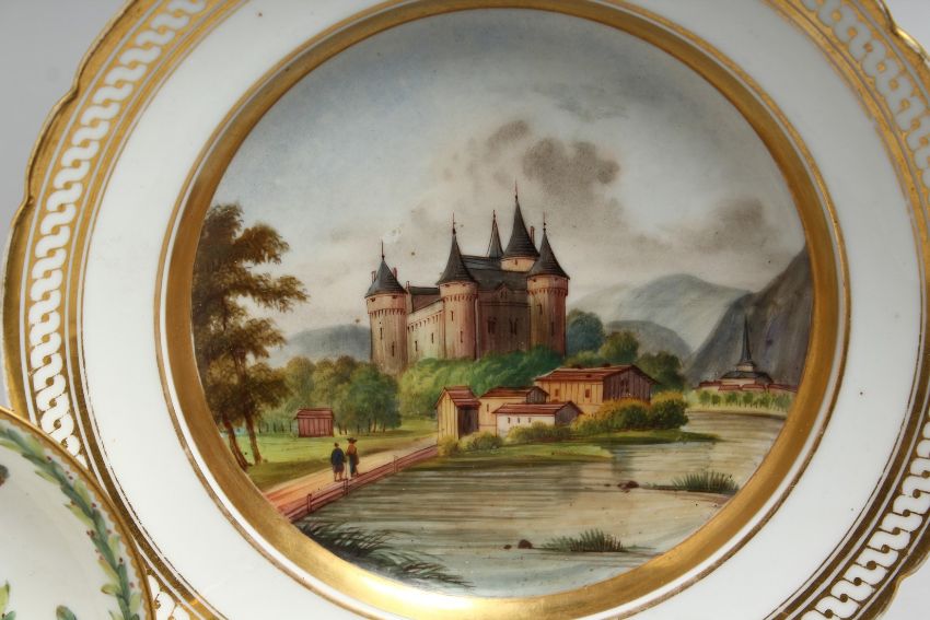 A SEVRES PORCELAIN CUP AND SAUCER painted with flowers and chains of husks and a PARIS PORCELAIN PLATE with titled scene and initials T H.