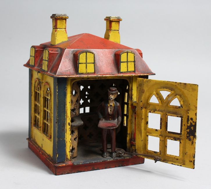 A RARE PAINTED CAST IRON NOVELTY BANK. 6.25ins high, 4.5ins square.