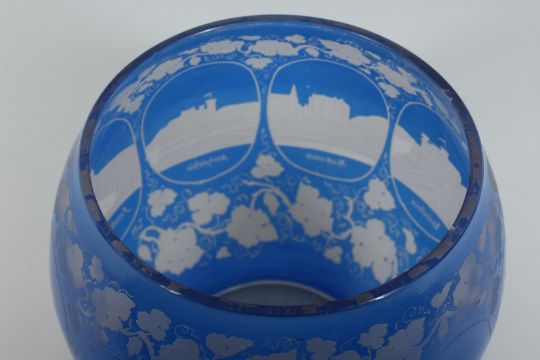 A SUPERB LARGE BOHEMIAN BLUE BOWL ON STAND, engraved with fruiting vines and eight engravings of castles and buildings, Johannesburg, Glozeaefels, etc..