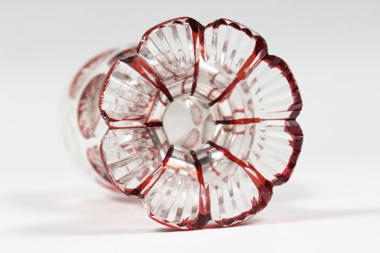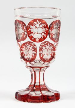 A GOOD BOHEMIAN GOBLET with eleven ruby panels of flowers. 6ins high.