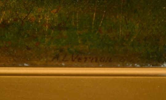 Arthur Langley Vernon (19th/20th Century) British, female figures gathering wood on a riverside path, oil on canvas, signed.