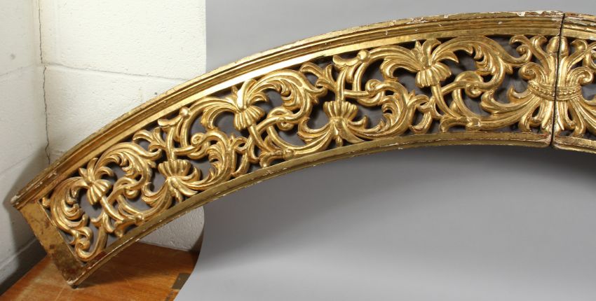 A GOOD GILTWOOD CARVED ARCH, HINGED. 9ft 6ins long, 10ins deep.