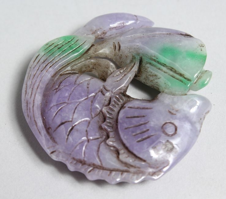 A LILIAC CARVED JADE PENDANT with seal mark 2.25ins.