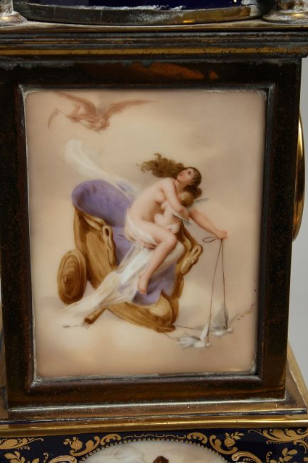 A VERY GOOD 19TH CENTURY VIENNA PORCELAIN CLOCK with metal supports and painted panels with cupids and classical scenes.
