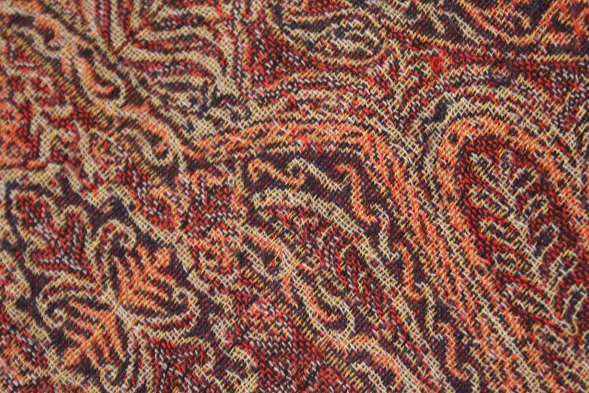 A KASHMIRI SHAWL woven in reds, creams and black to a Paisley design.