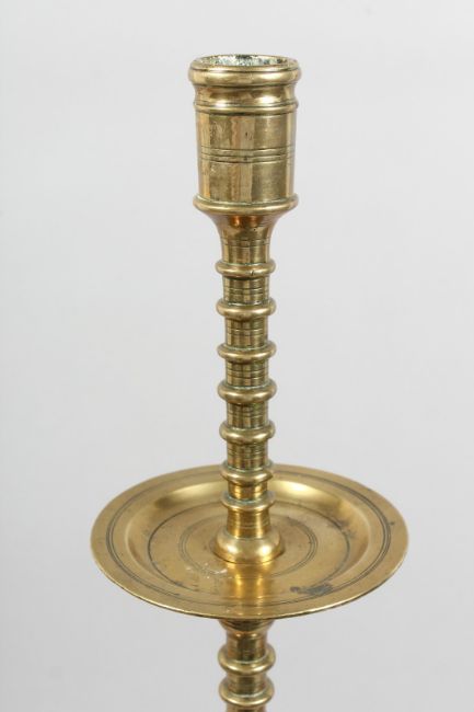 AN UNUSUAL LARGE 18TH / 19TH CENTURY BRASS CANDLE STAND, with a central turned column, broad drip pan on a circular base. 32ins high.