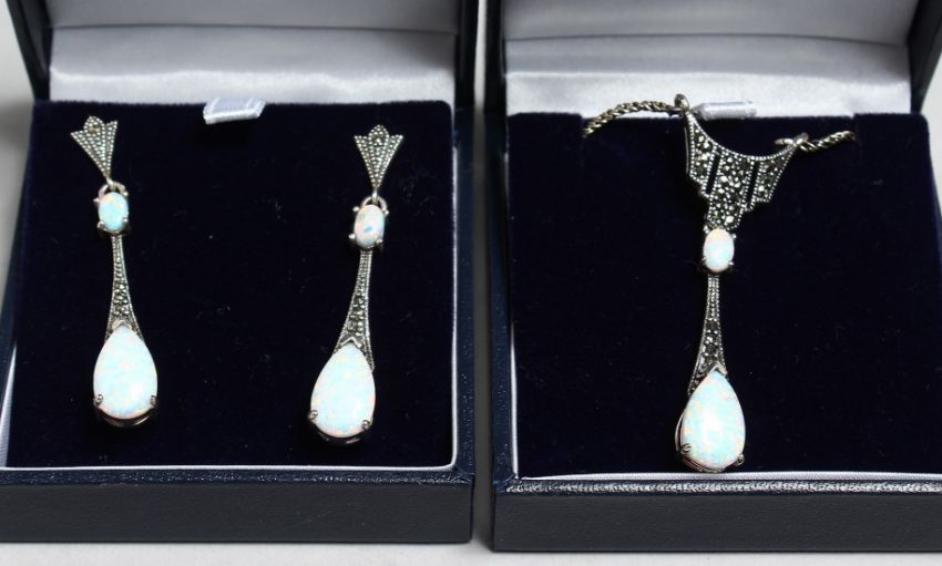 A SILVER ART DECO DESIGN OPAL AND MARCASITE PENDANT, CHAIN AND EARRINGS.
