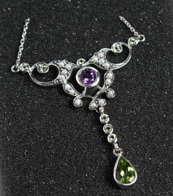 A GOOD PERIDOT, AMETHYST AND PEARL SUFFRAGETTE NECKLACE