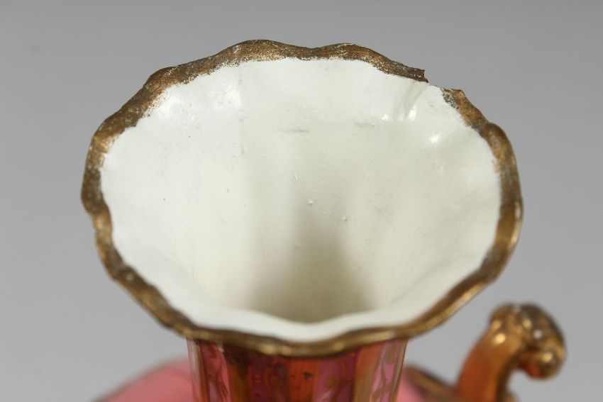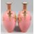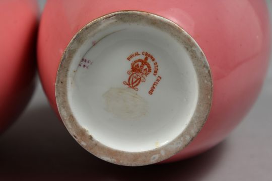 A PAIR OF ROYAL CROWN DERBY PINK GROUND TWO HANDLED VASES with gilt decoration