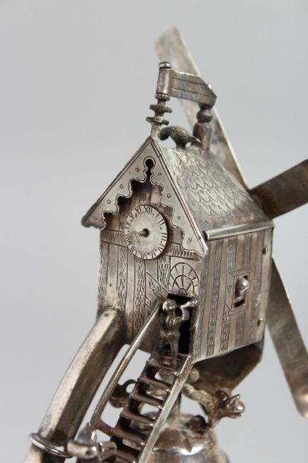 A DUTCH SILVER WINDMILL CUP with rotating blades and figures climbing a ladder. 8.5ins high.