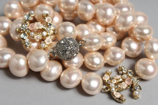 A GOOD CHANEL LONG LARGE PEARL NECKLACE with two intwined enamel 'C's'.