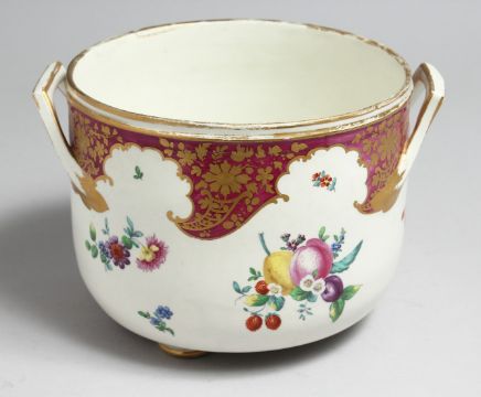 AN 18TH CENTURY WORCESTER ICE PAIL ON FEET painted with fruit and claret cornucopia, "In the London workshop of James Giles".