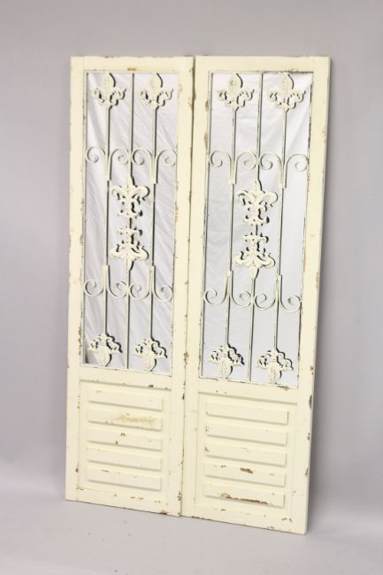 A PAIR OF CREAM GARDEN MIRRORS.