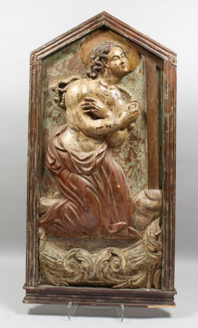 A LATE 17TH CENTURY CARVED WOOD AND POLYCHROME PANEL OF A SAINT WITH ARMS CROSSED in a wooden frame.