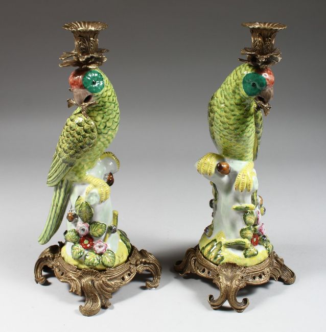 A GOOD PAIR OF CONTINENTAL PORCELAIN AND GILT METAL PARROT CANDLESTICKS. 14ins high.