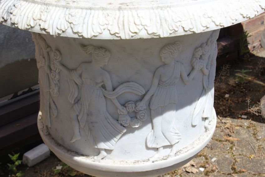 A PAIR OF CARVED WHITE MARBLE URNS ON STANDS.