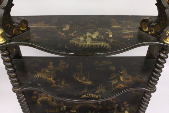 A GOOD 19TH CENTURY CHINNOISERE DECORATED SIX TIER BACK LACQUER WHAT NOT of serpentine outline, each tier united by brackets or barley twist columns.
