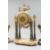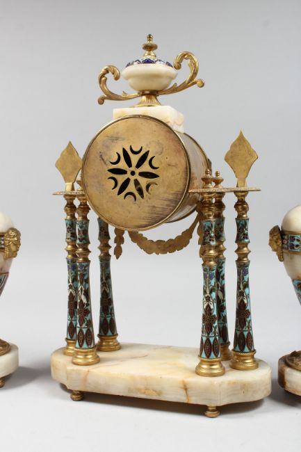 A 19TH CENTURY FRENCH MARBLE ORMOLU AND CHAMPLEVE ENAMEL CLOCK GARNITURE, the clock with eight day movement, striking on a bell, white enamel dial with Arabic numerals interspersed with floral swags, the case with urn finials, six column supports on a shaped base, with a pair of urn shaped side pieces.
