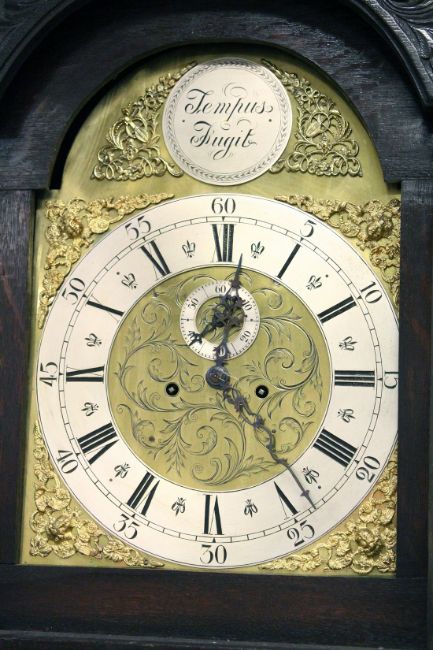 A 19TH CENTURY CARVED OAK LONG CASE CLOCK with eight day movement, arch brass dial with subsidiary seconds dial, engraved back plate and silvered chapter ring, in a carved oak case with figures and animals.