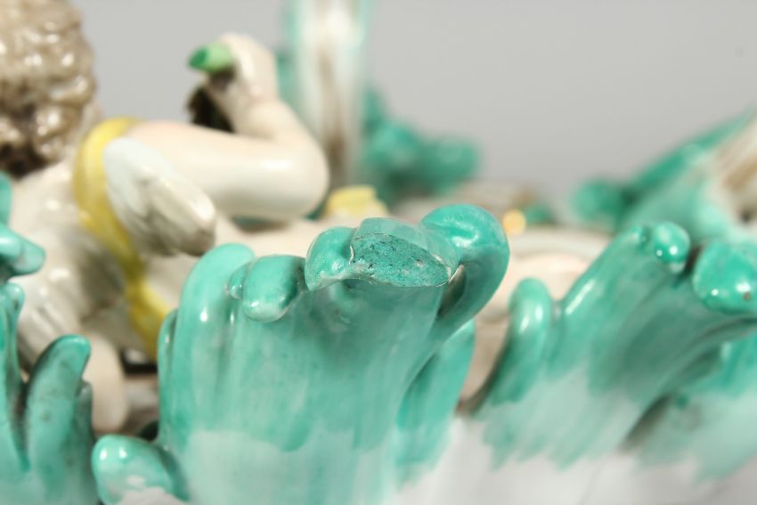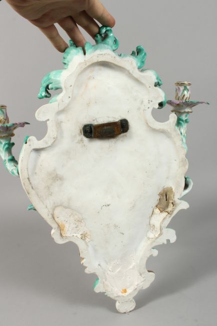 A PAIR OF THREE-BRANCH PORCELAIN WALL LIGHTS IN THE MEISSEN STYLE, decorated with cherubs, flowers, and painted with figures.