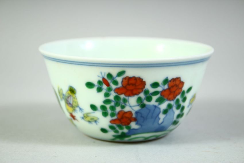 A CHINESE PORCELAIN CHICKEN CUP, the base with six character mark, 8cm diameter.