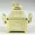 A CHINESE CARVED GREEN HARDSTONE TWIN HANDLE KORO AND COVER, the cover carved with foo dog, with ring handles and raised on four feet, 18cm wide.