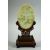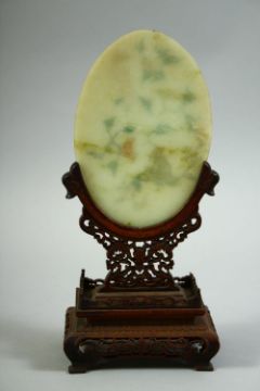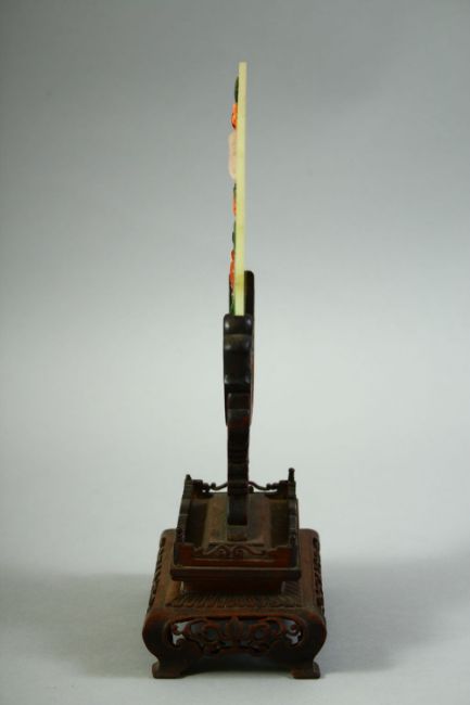 A CHINESE JADE AND HARD STONE OVAL TABLE SCREEN ON WOODEN STAND, the carved jade plaque onlaid with various stones depicting flora, supported on a carved and pierced wooden stand, overall 26cm high.