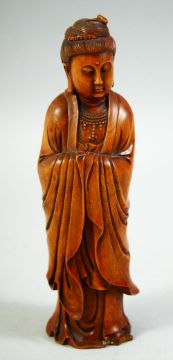 A FINE CHINESE BOXWOOD CARVING OF GUANYIN, 18cm high.