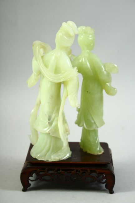 A CHINESE JADE FIGURAL GROUP ON A HARDWOOD STAND, the jade carved as two female figures, mounted to a carved and pierced hardwood base, overall 23cm high.