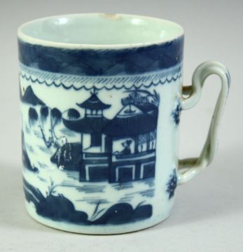 A CHINESE BLUE AND WHITE PORCELAIN TANKARD, decorated with a landscape scene, 11cm high.