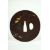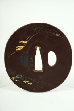 A JAPANESE BRONZE SHAKUDO TSUBA, depicting two figures in a courtyard scene beneath a tree, signed, 8.5cm x 8cm.