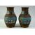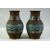 A PAIR OF ENAMELLED BRONZE TWIN HANDLE VASES, decorated with Eyptian figures and hieroglyphics, 27cm high.