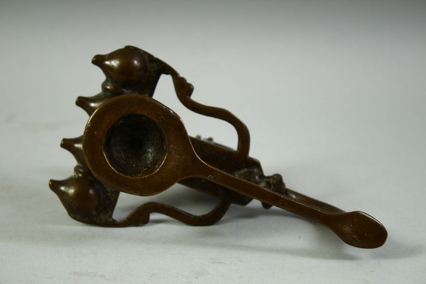 A FINE 17TH / 18TH CENTURY SOUTH INDIAN BRONZE OIL LAMP, with elephant and rider finial, 16cm long.
