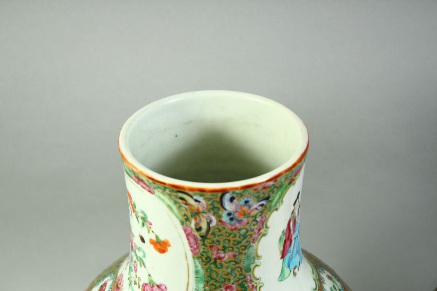 A PAIR OF CHINESE CANTON FAMILLE ROSE PORCELAIN VASES AND COVERS, painted with panels of figures as well as birds, butterflies and native flora, the cover of each with moulded lion dogs finial, overall height 51cm.