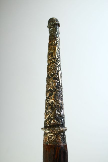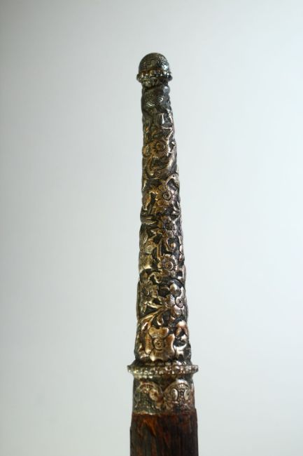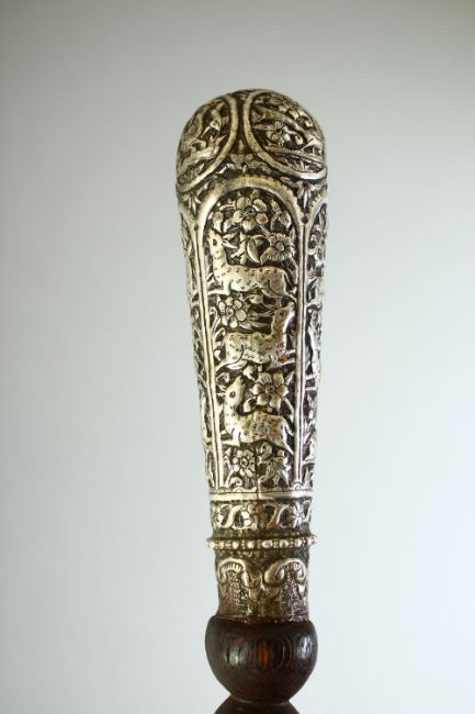 A LARGE DERVISH WALKING STICK, with ornate white metal handle and ferrule; with chased decoration depicting flora and fauna, 98.5cm long.