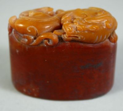 A CHINESE CARVED HARDSTONE BLANK SEAL, the top carved with chilong / dragon, in a fitted box, 4.5cm wide.