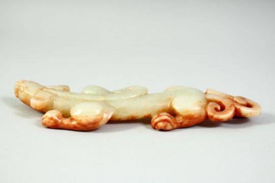A CHINESE CARVED JADE / HARDSTONE FIGURE of a chilong dragon, 17cm long.
