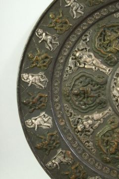 A LARGE INDIAN SILVER ONLAID COPPER CHARGER, with raised panels of various figures including musicians and dancers, 44.5cm diameter.