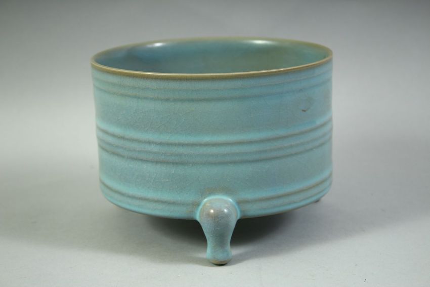A CHINESE CELADON GLAZE PORCELAIN TRIPOD CENSER, 17.5cm diameter.