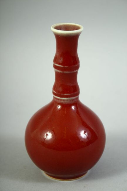 A SMALL CHINESE RED GLAZE BOTTLE VASE, 12cm high.