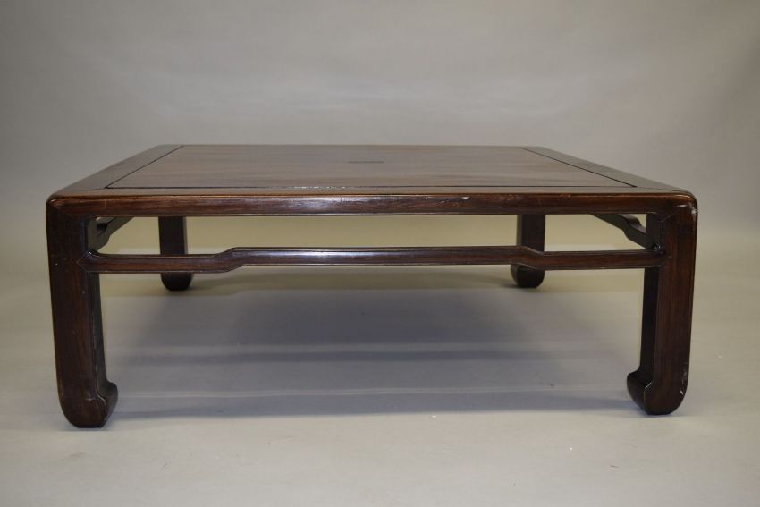 A GOOD CHINESE HARDWOOD SQUARE TABLE, on square form legs, 33cm high, 90cm square.