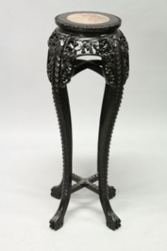 A CHINESE HARDWOOD AND MARBLE INSET CIRCULAR VASE STAND, with pierced and carved frieze and similar brackets to the carved curving legs united by an 'x' shaped stretcher, 90cm high, 27cm diameter.