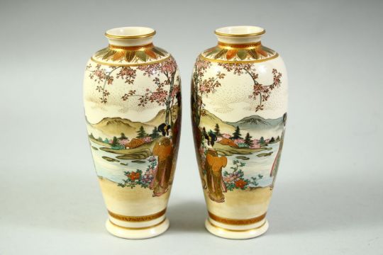 A PAIR OF JAPANESE SATSUMA VASES, painted with female figures in a landscape and further embellished with gilt highlights, the bases with marks, complete with original wooden box, vases 16cm high.
