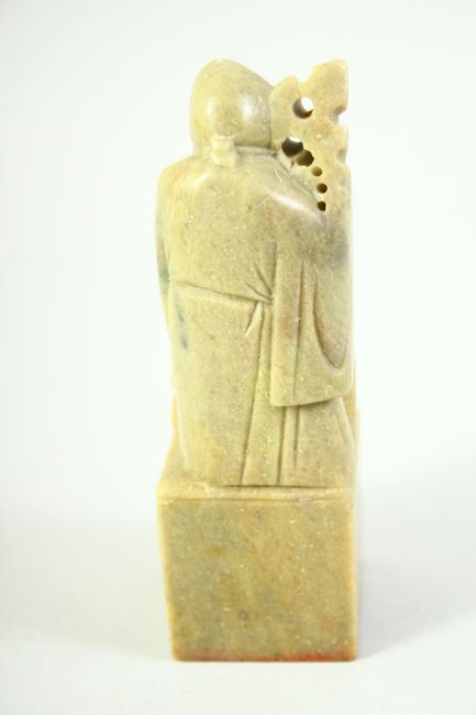 A CHINESE CARVED GREEN SOAPSTONE SEAL, carved with a figure and a boy, 12cm high.