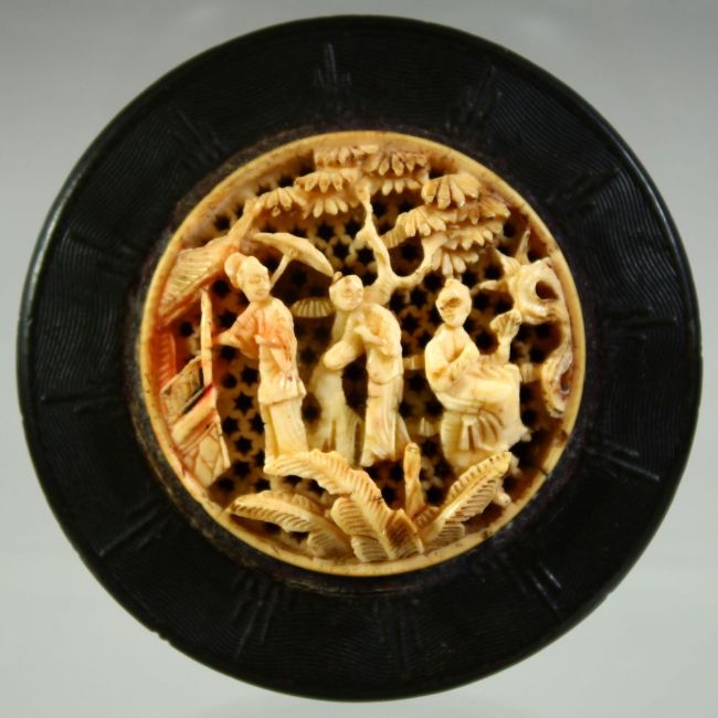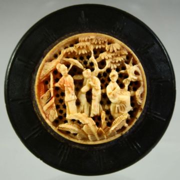 A CHINESE CANTON EBONISED CIRCULAR LIDDED BOX WITH IVORY INSET, the ivory roundel carved and pierced with figures beneath a tree, 6cm diameter.