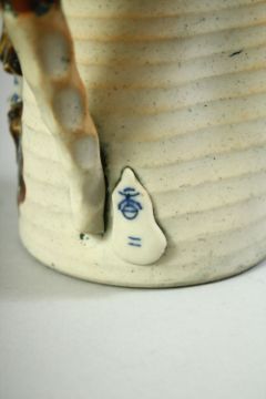 A GOOD JAPANESE SUMIDA COFFEE POT AND COVER, decorated with two partly glazed figures in relief, signed to the side of lower handle, 21cm high.