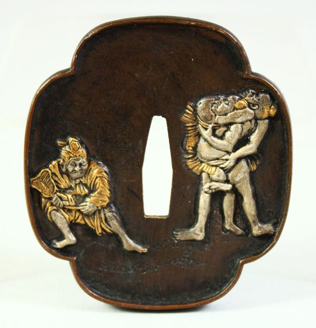 A JAPANESE BRONZE SHAKUDO TSUBA, of quatrefoil form depicting figures to one side, the reverse with a mountainous landscape, signed and inscribed, 8cm x 7cm.
