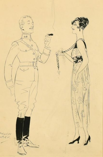 Helen Madeleine Mckie (1889-1957), a scene of a courting couple one a United States military officer, ink drawing, signed, 10" x 6.5".