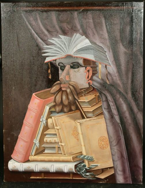 After Arcimboldo, a mid-20th copy of an anthropomorphic portrait of a librarian composed of books, oil on canvas, 28" x 38".